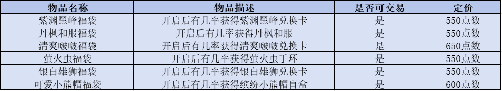 商城指定的【紫渊黑峰福袋】、【丹枫和服福袋】、【清爽啵啵福袋】、【萤火虫福袋】、【银白雄狮福袋】、【可爱小熊帽福袋】。