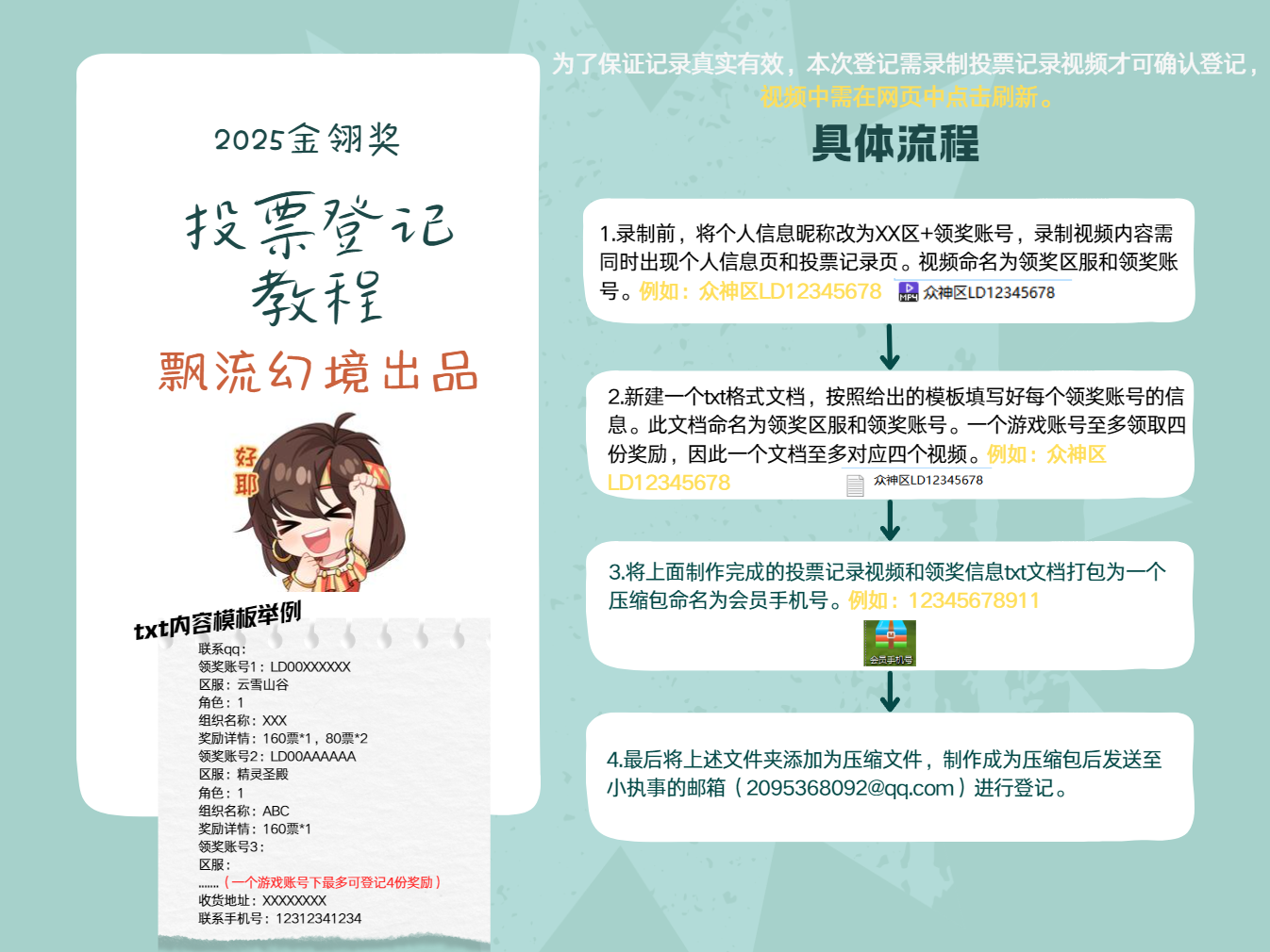 6.打包压缩的文件名需以会员手机号命名(一个会员号一个压缩包),压缩包中需列出txt文档说明,内容为联系QQ、领奖账号、区服、角色、周边收货地址及联系方式、组织名称,并包含投票视频。投票视频和txt文档命名为XX区+领奖账号(例:众神区LD12345678),登记信息不全会视为登记失败。
