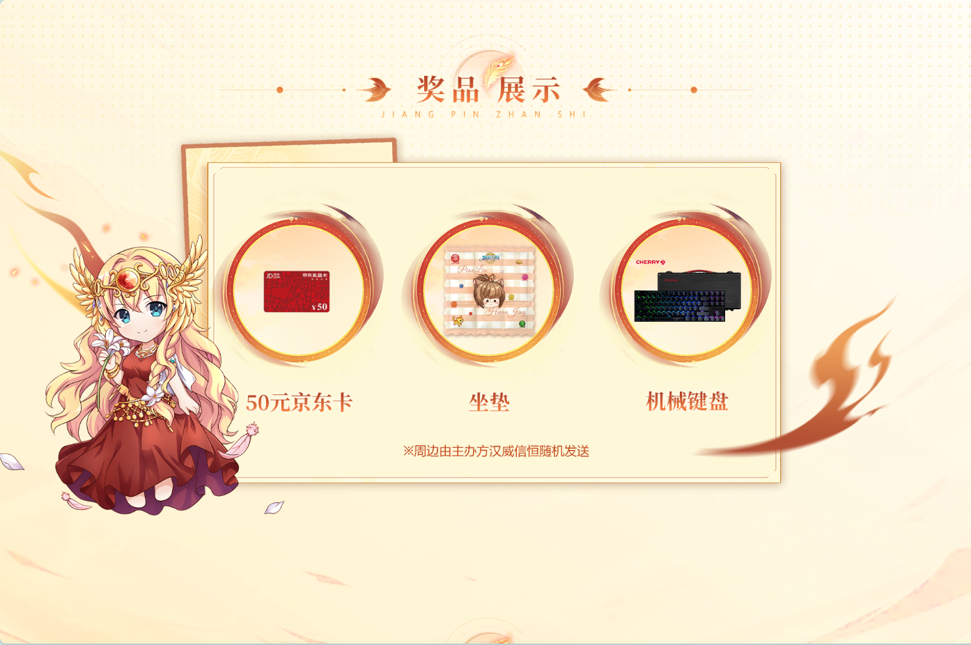 注:周边奖励总限量80份先到先得(须在登记时注明需要周边奖励,以登记顺序为准),其中眼罩10个、雨伞20个、坐垫10个、扑克牌5个、马克杯5个、帆布包30个,所登记的奖励数量不足时将从其他奖励中随机发放,80份周边全部发放后,后续玩家均发放游戏道具作为奖励