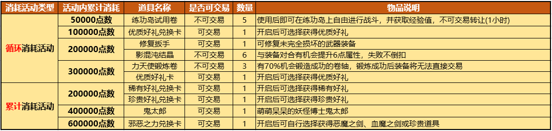 下图中,前四档50000/100000/200000/300000点数消耗奖励为循环消耗奖励,活动内消耗达到300000点数后,继续消耗50000点数,可循环获得第一档50000点数消耗奖励。