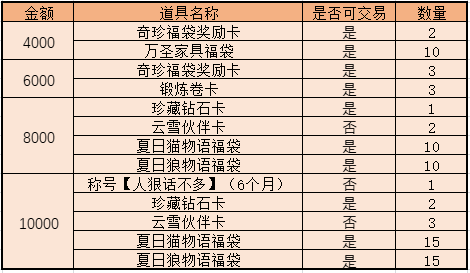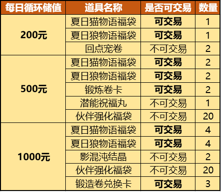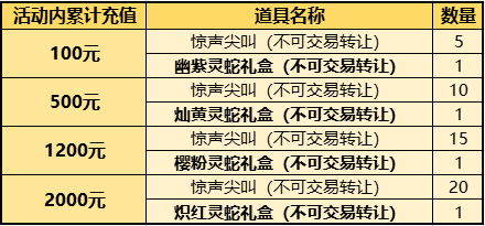 2.本活动各档位奖励叠加获得,当储值后,根据本期储值活动内累计金额即可获得该金额对应的档位及其之前档位的所有奖励。例如某游戏帐号当天充值2000元,则将获得1,2,3,4档位奖励;