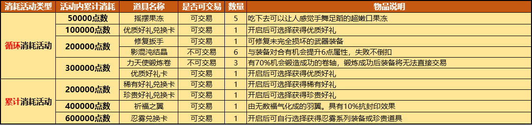 下图中,前四档50000/100000/200000/300000点数消耗奖励为循环消耗奖励,活动内消耗达到300000点数后,继续消耗50000点数,可循环获得第一档50000点数消耗奖励。