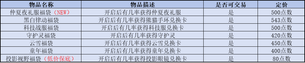 本期商城福袋更新为大家带来了全新福袋【仲夏夜礼服福袋和经典返场的【黑白律动福袋【科技战服福袋【守护灵福袋【云雪福袋、【童年福袋】、【投影视野福袋感兴趣的小伙伴们快来看看吧!