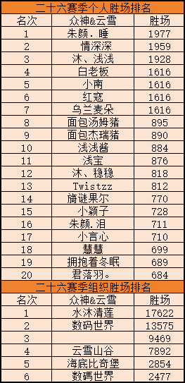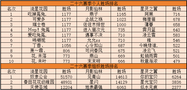 由于【月影仙林】个人胜场排名第五的【遇事不决】、【允允ss】胜场相同,因此获得并列第五名的奖励,
