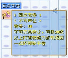 回点宠卷:不可交易转让,可将20级以上的宠物能力点数退回一点的神秘手卷