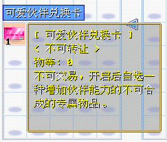可爱伙伴兑换卡:不可交易,开启后自选一种增加伙伴能力的不可合成的专属物品。
