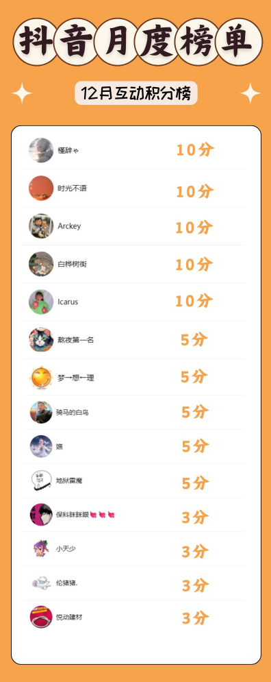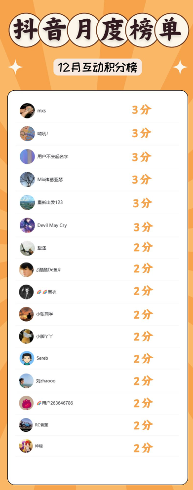 事件一:抖音铁粉活动12月积分公示