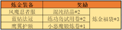 【活动内容】在活动有效期间内,本公告将公布三件炼金装备,每种炼金装备对应不同的奖励,合成三种炼金装备可以额外获得炼金福袋*3的奖励~