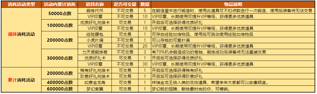 下图中,前四档50000/100000/200000/300000点数消耗奖励为循环消耗奖励,活动内消耗达到300000点数后,继续消耗50000点数,可循环获得第一档50000点数消耗奖励。