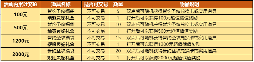 活动时间内累计储值达指定金额(不含月卡),即可获得对应的奖励!玩家所获得回馈内容,在储值达累计数量后直接派发!!(储值时为了奖励顺利到账,请保持账号为在线状态)