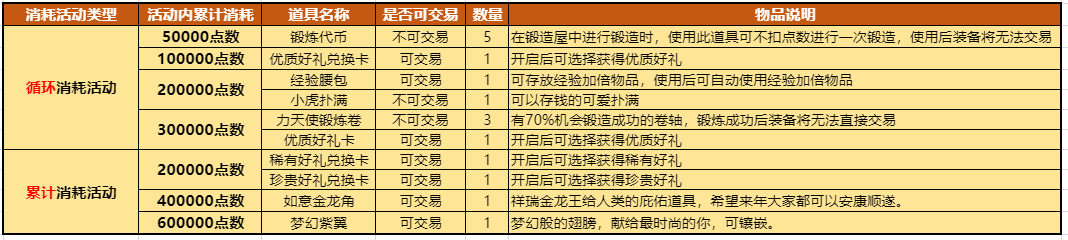 下图中,前四档50000/100000/200000/300000点数消耗奖励为循环消耗奖励,活动内消耗达到300000点数后,继续消耗50000点数,可循环获得第一档50000点数消耗奖励。
