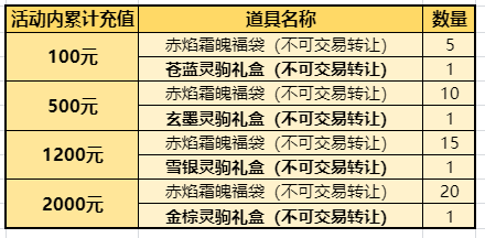 活动时间内累计储值达指定金额(不含月卡),即可获得对应的奖励!玩家所获得回馈内容,在储值达累计数量后直接派发!!(储值时为了奖励顺利到账,请保持账号为在线状态)
