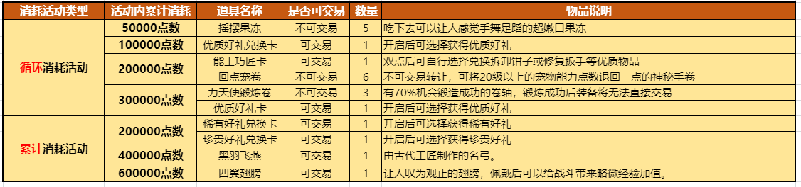 下图中,前四档50000/100000/200000/300000点数消耗奖励为循环消耗奖励,活动内消耗达到300000点数后,继续消耗50000点数,可循环获得第一档50000点数消耗奖励。