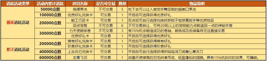 下图中,前四档50000/100000/200000/300000点数消耗奖励为循环消耗奖励,活动内消耗达到300000点数后,继续消耗50000点数,可循环获得第一档50000点数消耗奖励。