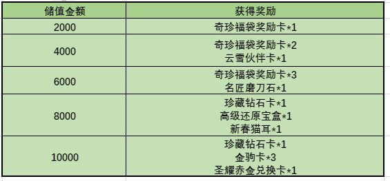 (举个例子,阿茶储值20000元,循环2次,可以获得奇珍福袋奖励卡*12,云雪伙伴卡*2,名匠磨刀石*2,珍藏钻石卡*4,高级还原宝盒*2,新春猫耳*2,金驹卡*6,圣耀赤金兑换卡*2,再储值2000元(总计22000元)可以再次获得奇珍福袋奖励卡*1,总计获得珍贵福袋奖励卡*13,云雪伙伴卡*2,名匠磨刀石*2,珍藏钻石卡*4,高级还原宝盒*2,新春猫耳*2,金驹卡*6,圣耀赤金兑换卡*2)