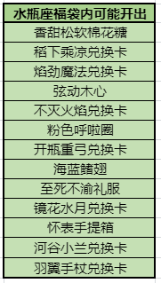 【奇珍福袋奖励卡】开启后可从以下稀有福袋中选择一种(每种福袋数量为10,且包含福袋均有保底活动):纹银弦月福袋、七香车福袋、凤蝶墨翅福袋、惩戒法剑福袋、心心相印福袋、狂暴吉他福袋、熊猫装福袋、刀锋之翼福袋、舞剑仙福袋、神狐福袋、魔神降临福袋、紫墨幻翼福袋