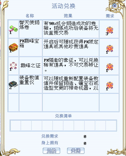 PK巅峰宝箱(不可交易转让):有机会开出手套附魔卷、鞋子附魔卷、巅峰之证、真混沌结晶、能力提升福袋等珍贵道具。