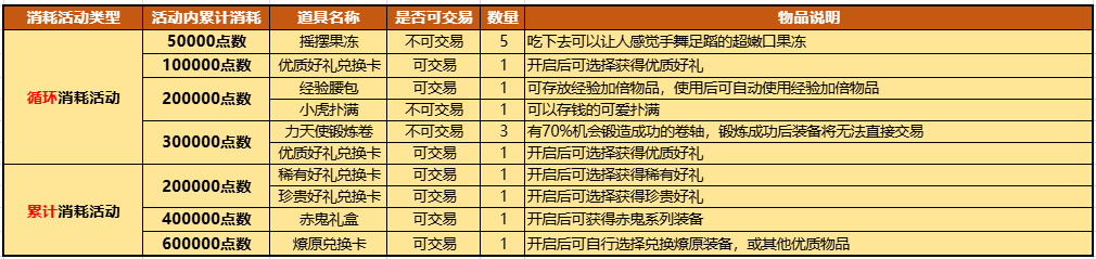 下图中,前四档50000/100000/200000/300000点数消耗奖励为循环消耗奖励,活动内消耗达到300000点数后,继续消耗50000点数,可循环获得第一档50000点数消耗奖励。