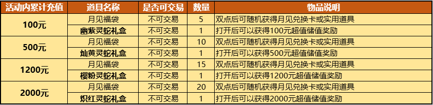 活动时间内累计储值达指定金额(不含月卡),即可获得对应的奖励!玩家所获得回馈内容,在储值达累计数量后直接派发!!(储值时为了奖励顺利到账,请保持账号为在线状态)